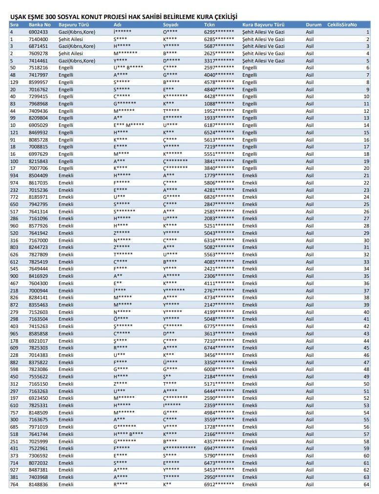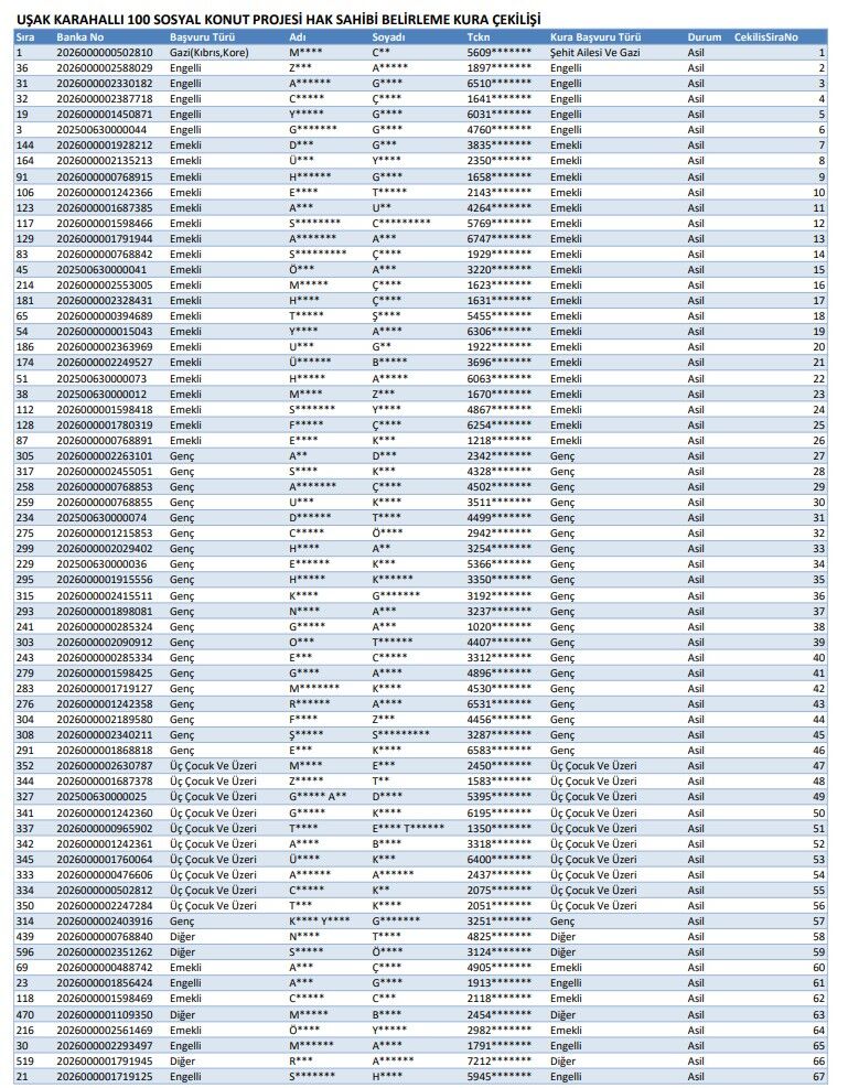 Uşak'ta bir dizi yatırım kararı alan ve 500 bin sosyal konut kapsamında Merkez'de 1570 konut inşa edecek olan TOKİ, ilçelerde de yatırımlar yapacak. TOKİ'nin Banaz'da ve Eşme'de 300'er, Ulubey ve Karahallı'da 100'er ve Sivaslı ile bağlı olan Pınarbaşı beldesinde de 94'er TOKİ evi yapacağı kurum tarafından bildirildi. Sağlam ve depreme dayanıklı olan TOKİ konutlarının çıktığı listeler belli oldu ve kurumun resmi internet sitesinde yayınlandı. AK Parti Uşak İl Başkanı Himmet Yaşar, Uşak Merkez'in yanı sıra TOKİ'nin ilçelerde de önemli yatırımlar yapacağını belirterek, tüm vatandaşlara sonuçların hayırlı olmasını diledi. Buna göre listede adı çıkan Banaz, Eşme, Ulubey, Karahallı, Sivaslı ve Pınarbaşılı vatandaşların isimleri ve kısmen verilen bilgileri şöyle:
