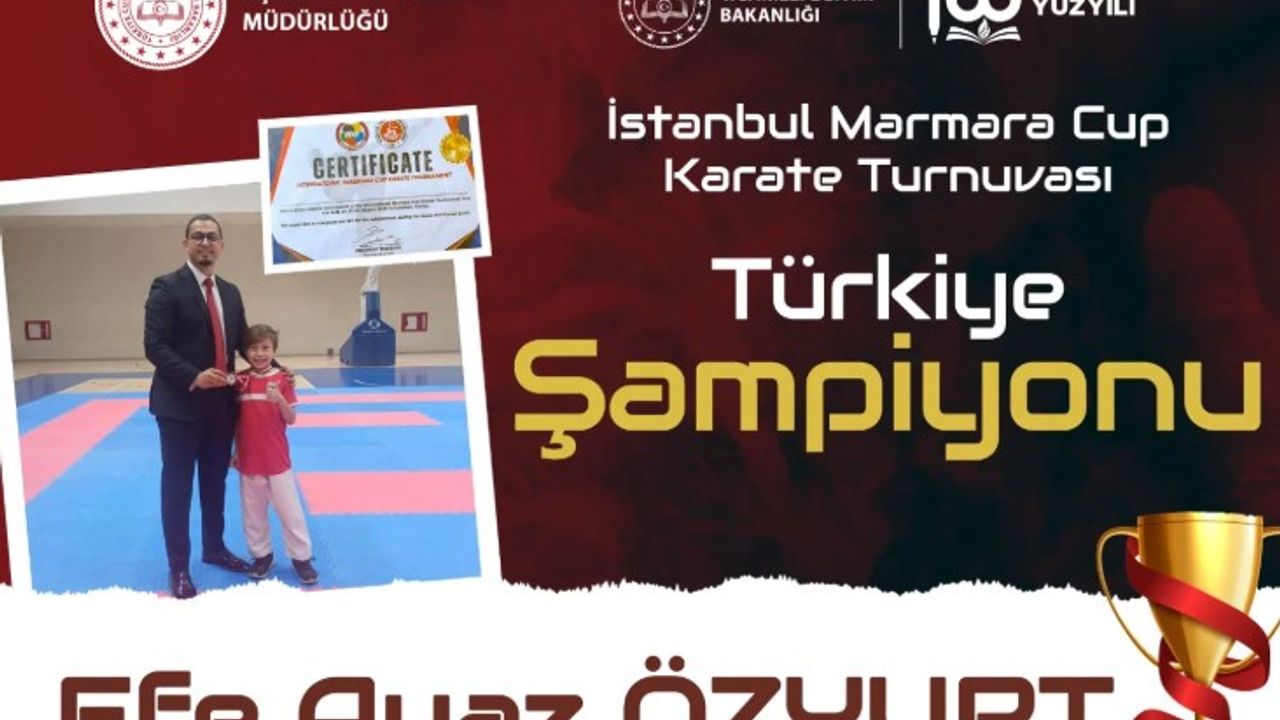 Uşak Gazi Mustafa Kemal Atatürk İlkokulu'ndan Efe Ayaz Özyurt, 22 ve 24 Ağustos Tarihleri arasında İstanbul Marmara Cup Karate Turnuvasına katıldı. 8-9 yaş kategorisinde mücadele eden Efe Ayaz Özyurt, Türkiye birincisi oldu. Uşak İl Milli Eğitim Müdürü Halil Yücel, Türkiye birincisi olan Efe Ayaz Öztürk'ü makamında kabul etti ve hediyeler takdim etti. Efe Ayaz Öztürk'ü tebrik eden Halil Yücel, "Kendisiyle gurur duyuyor, bu büyük başarisından dolayı tebrik ediyor ve başarılarının devamını diliyoruz" dedi.