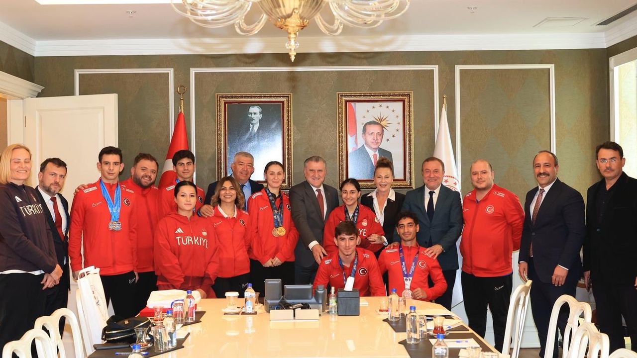 Hindistan’daki Dünya Para Atletizm Şampiyonası’nda 800 Metre koşu branşında dünya üçüncülüğü kazanan Mehmet Emin Eğilmez ile gülle atma branşında dünya ikinciliğini elde eden Ebrar Keskin ve antrenörleri Sevda Kalkan’ı ağırlayan Bakan Bak’ın makamında şu sporcular da kabul edildi;